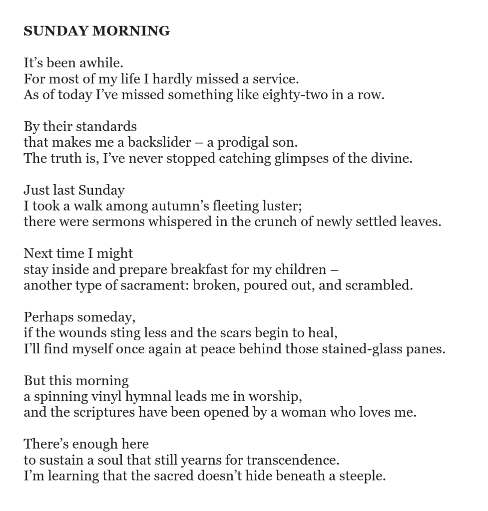 At a deeper level, however, this poem is a heartfelt response to anyone who assumes that leaving church is the same thing as losing faith. For many of us who aren’t in the pews on Sunday mornings, there’s still plenty in the world to stir our hearts and fill us with mystery. Whether it’s nature, food, music, sex, art, friendships, exercise, or a hundred other things, the light of divine presence still shines brightly outside the organized church. Yes, our Sundays—and our faith expressions as a whole—may look vastly different than they used to. But there is so much robust spirituality to be enjoyed in a life of attentiveness and gratitude. I hope this can celebrate that.